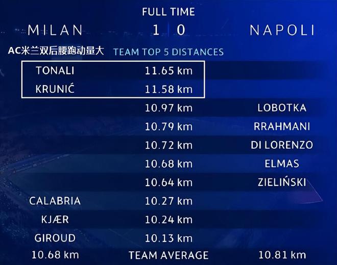 本场比赛AC米兰的双后腰压力很大,他们的跑动输出都超过了11.5公里,也是相当惊人。