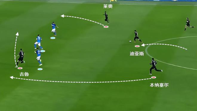 当那不勒斯还剩下3名后卫,他们选择收紧中路时,就是靠着吉鲁的跑动掩护将人往莱奥方向带,让本纳塞尔充分利用到了后点的空位。