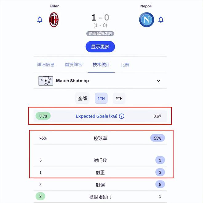从上半场的统计数据看,那不勒斯控球率多出10个百分点,射门数近乎翻倍AC米兰。
