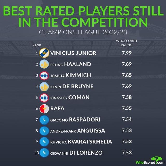 whoscored列当前欧冠球员评分榜: