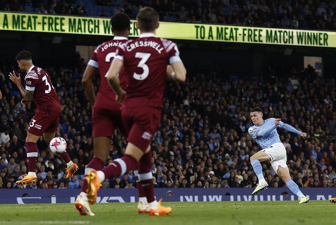 西汉姆联阵容做了多处调整但并无改观。而第77分钟才上场的福登在8分钟后建功,一脚禁区外凌空抽射打在对方球员小腿上变线入网。