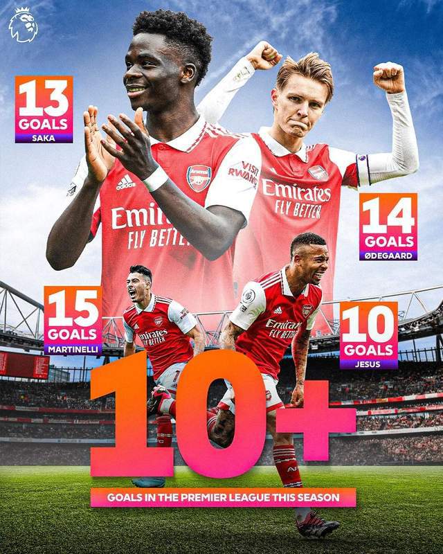 阿森纳本赛季在英超已经有4人进球上双:马丁内利15球,厄德高14球,萨卡13球,热苏斯10球。