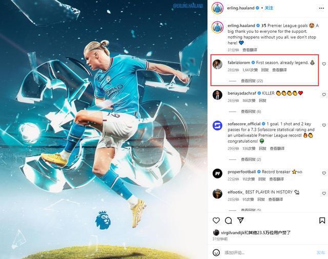 赛后,哈兰德更新社媒晒出破纪录海报,名记罗马诺评论:“处子赛季,已是传奇。”并附上♂️(打坐)emoji。