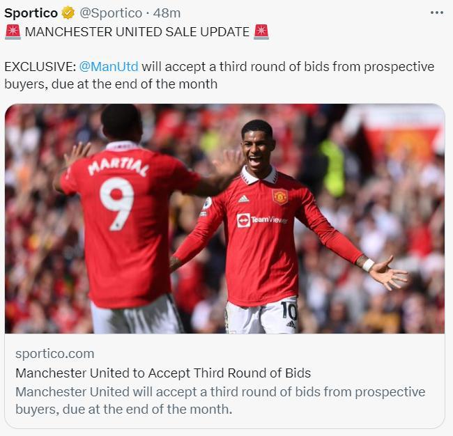 根据Sportico的报道,曼联的竞购即将进入第三轮报价阶段,阿勒萨尼、英力士财团都进入了第三轮报价,还有另外的5个并未公开的私人报价将会进行第三轮的竞价,第三轮竞价将会在4月底结束,换句话说曼联的出售又一次被推迟了。