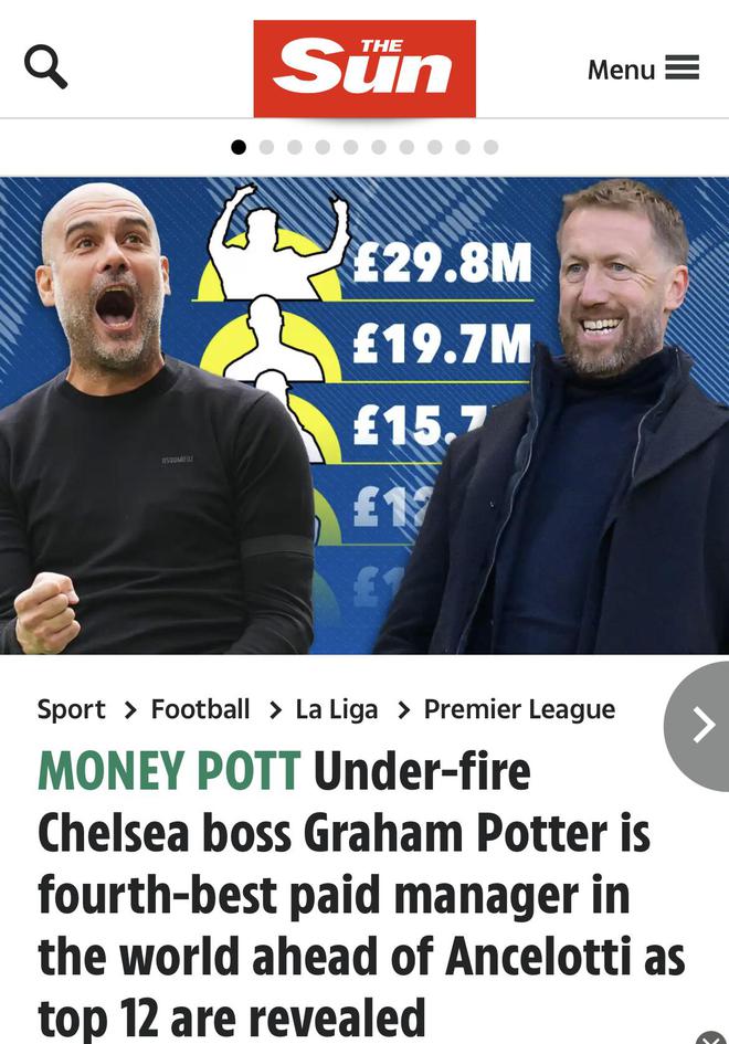 英国当地时间2023年3月30日16:51,此时的切尔西主帅波特还未下课。英国知名媒体太阳报公布了世界足坛年薪最高的十二名主教练。