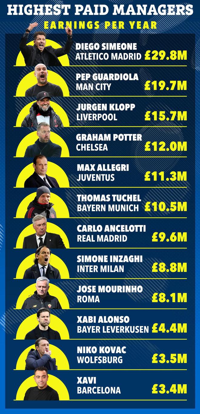 在该榜单中,只有马德里竞技主教练西蒙尼、曼城主帅瓜迪奥拉和利物浦主帅克洛普的年薪比波特多。