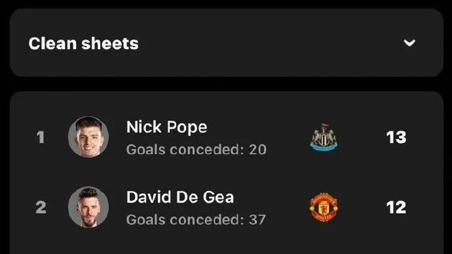 德赫亚以12次联赛零封排名第二,只比第一的纽卡斯尔门将波普少一次。曼联的丢球数为37个,而纽卡斯尔只有20个。