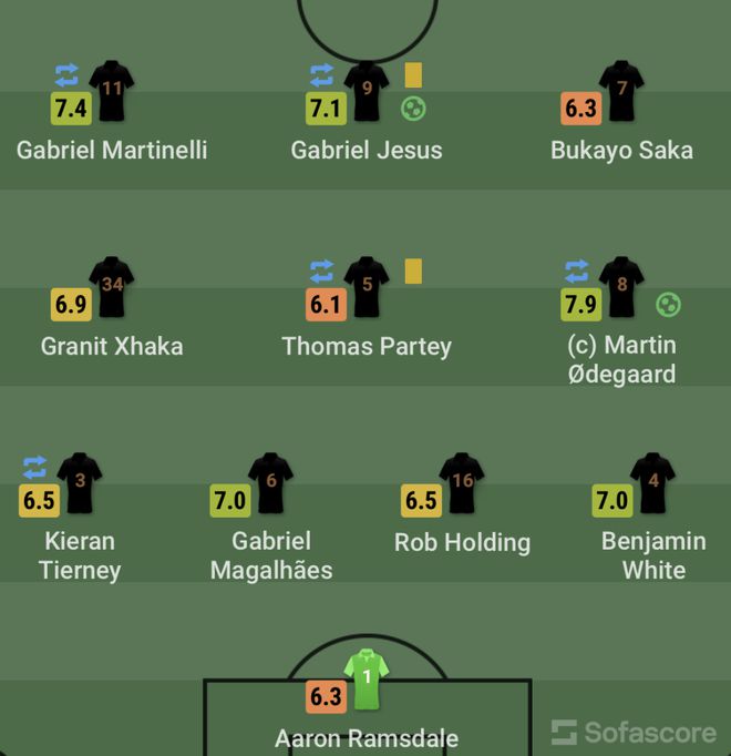 阿森纳首发:1-拉姆斯代尔、4-本-怀特、16-霍尔丁、6-加布里埃尔-马加良斯、3-蒂尔尼(85'21-法比奥-维埃拉)、5-托马斯-帕尔特伊(67'20-若日尼奥)、34-扎卡、8-厄德高(90'14-恩凯蒂亚)、7-布卡约-萨卡、11-马丁内利(85'24-内尔森)、9-热苏斯(67'19-特罗萨德)