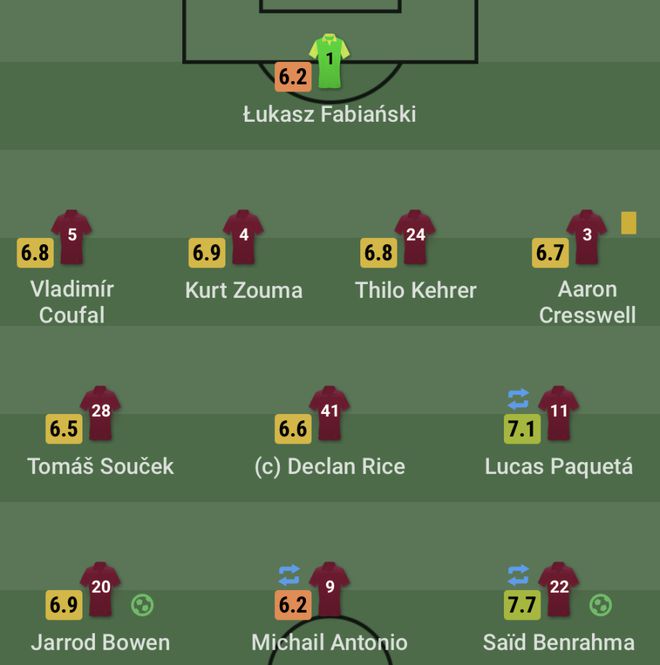 西汉姆联首发:1-法比安斯基、3-克雷斯维尔、24-蒂洛-科雷尔、4-祖马、5-曹法尔、41-德克兰-赖斯、28-绍切克、20-鲍文、11-帕奎塔(87'12-唐斯)、22-本拉赫马(91'8-福尔纳尔斯)、9-安东尼奥(87'14-科尔内)