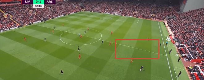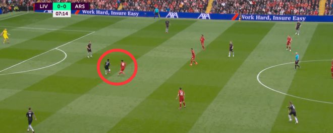 相比于右路阿诺德的半场低迷,左路的若塔,在利物浦处于被动时给予球队很大的支持。第20分钟,利物浦前场抢断,此前采用常规进攻手段无果的若塔,选择了战术性回撤和拉边,让罗伯逊前插到更深入的位置。这一方式果然起到了很好的效果,阿森纳右后卫本-怀特在防守选择中产生了犹豫,一时间不知道是应该去跟防若塔还是罗伯逊。而就是这一瞬间的犹豫,给了罗伯逊反越位的空间,最终形成了一次不错的射门机会,这也是利物浦本场比赛第一次真正意义上有威胁的进攻。