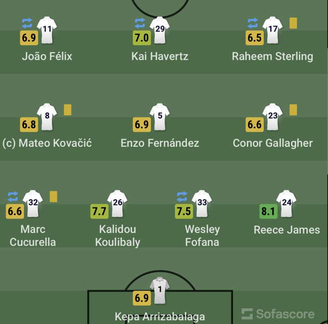 切尔西首发:1-凯帕、24-里斯-詹姆斯、26-库利巴利、33-韦斯利-福法纳(79'14-特雷沃-查洛巴)、32-库库雷利亚(68'21-奇尔韦尔)、5-恩佐-费尔南德斯、8-科瓦契奇、23-加拉格尔、11-若昂-菲利克斯(63'9-奥巴梅扬)、17-斯特林(68'15-穆德里克)、29-哈弗茨(68'10-普利西奇)