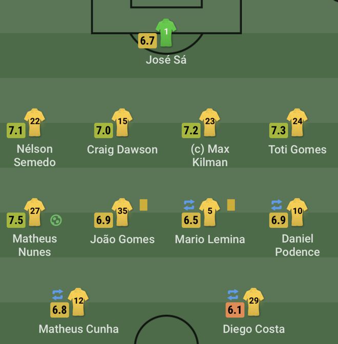 狼队首发:1-若泽-萨、22-塞梅多、15-克雷格-道森、23-基尔曼、24-托蒂-戈麦斯、10-波登斯(63'28-穆蒂尼奥)、5-勒米纳(74'37-阿达玛-特拉奥雷)、35-若昂-戈麦斯、27-马特乌斯-努内斯、29-迭戈-科斯塔(63'11-黄喜灿)、12-马特乌斯-库尼亚(74'21-萨拉维亚)