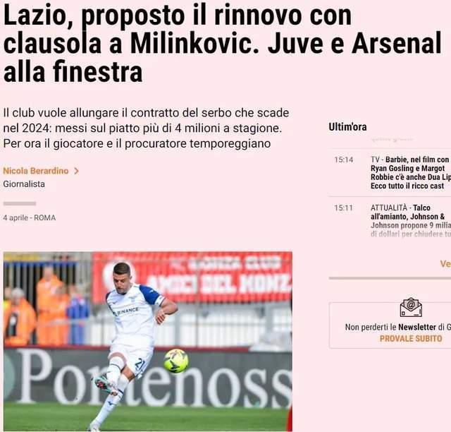 当然,拉齐奥不想明年夏天免费放走28岁的米林科维奇,而报道称一份4000万欧元的报价就足以说服他们卖人。