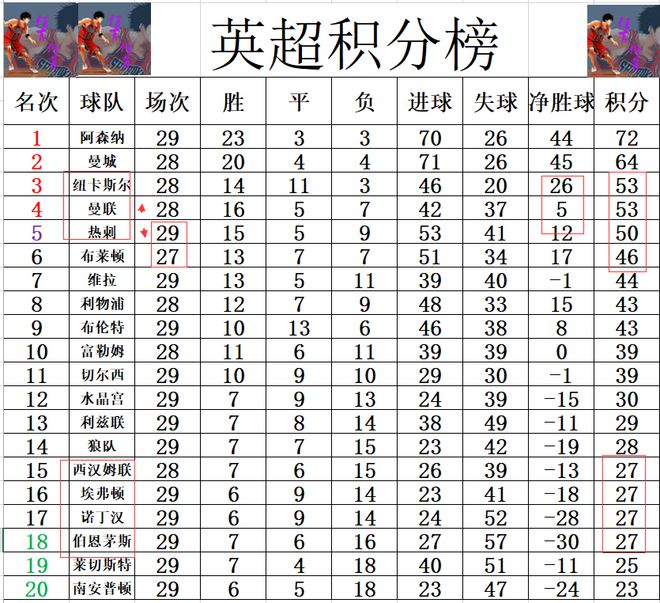 积分榜方面,阿森纳多赛一轮8分优势力压曼城领跑,纽卡斯尔,曼联今天双双赢球,大胜的纽卡斯尔净胜球比曼联多了21个之多,他们继续以净胜球力压曼联守住第3的位置。曼联则是超过热刺3分,重新回到前4。昨天无力击败切尔西的利物浦,如今落后前四有10分之多,争四基本无望了。西汉姆联惨败,保级的竞争依然是非常惨烈,4队同积27分,都是分分钟就可能跌入降级区。