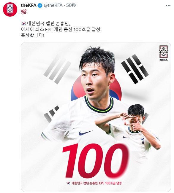 这是孙兴慜在英超联赛中攻入的第100粒进球,韩国足协官方账号在社交媒体上晒出为孙兴慜制作的海报,祝贺他成为首位达成英超百球的亚洲球员。