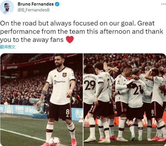 直播吧4月17日讯 曼联在本轮英超2-0力克诺丁汉森林,中场大将B费在赛后发文庆祝了胜利。