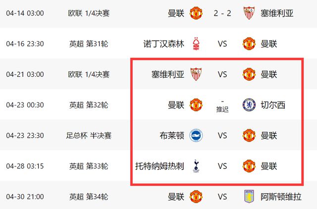 不要忘了,打完热刺的比赛,曼联还要接连对阵维拉和布莱顿,万一进入欧联杯四强,5月份曼联还要踢半决赛,未来这差不多2个月的时间,曼联基本都是双线作战,他们现在的体力已经严重透支,如果不能早早在争四大战中确立优势,后面就难说了!