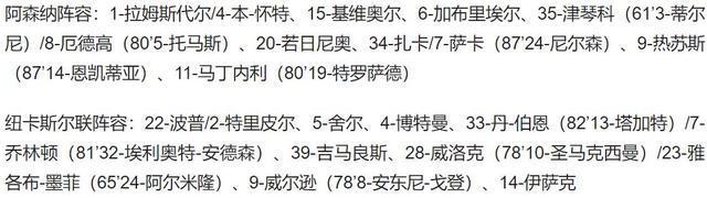 第63分钟,乔林顿在禁区右侧回传,弧顶处的吉马良斯推射被拉姆斯代尔封住。第71分钟,马丁内利带球突入禁区左侧,他在底线前扫向中路,纽卡后卫舍尔伸脚解围却自摆乌龙,阿森纳2-0领先纽卡斯尔。