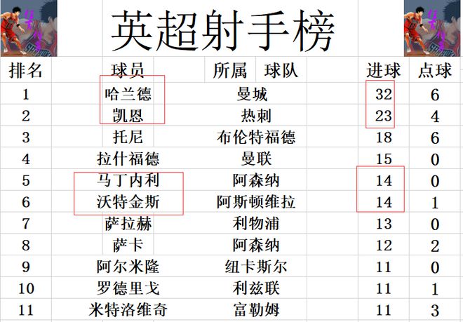 射手榜方面,哈兰德追平纪录,32球稳稳领跑,打破纪录基本上是问题不大了,大家觉得能突破40+吗?凯恩今天哑火,又被进一步拉大差距,要追是追不上,恐怕之后还要被拉大差距。沃特金斯近来状态是真火,昨晚梅开二度后追上了马丁内利并列第5,差第4的拉什福德1球。