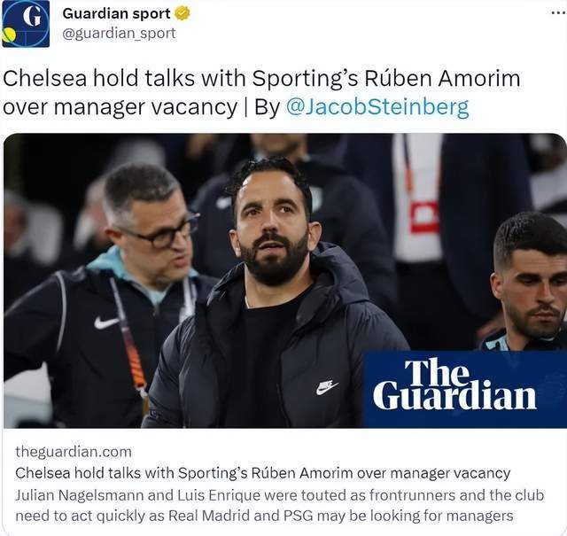 卫报记者JS消息,切尔西已经和葡萄牙体育主教练鲁本-阿莫林展开了谈判,他们仍在继续搜寻新的长期主帅。