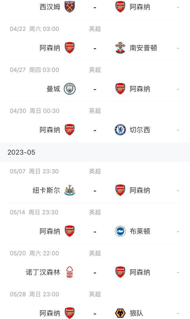 阿森纳剩余赛程: