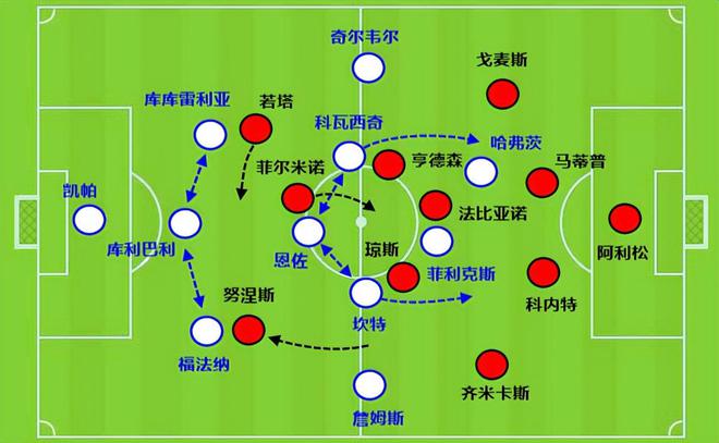 坎特断球齐米卡斯是攻防转换的开始,反击中哈弗茨拉边接应,随后想横传找菲利克斯,套路是极为清晰的。