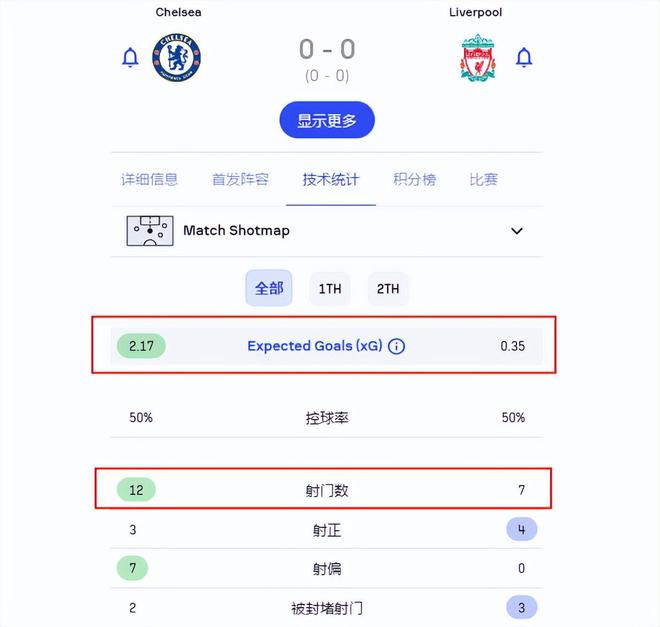 从统计数据可以看到,切尔西预期进球2.17比0.35领先,是利物浦的6.2倍。