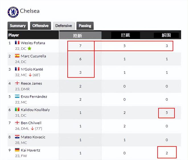 福法纳的防守数据非常抢眼,切尔西三中卫是既可以上抢又能够解围,就连哈弗茨也时不时退防抢断和解围(虽然他在利物浦禁区也有解围,不过统计上的2次都是在切尔西防线完成的)。