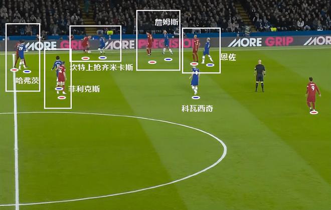 这一回利物浦发边线球时,切尔西的中场防守强度真的很可怕。菲利克斯和哈弗茨也回到中场,形成每一个位置的一对一贴防。