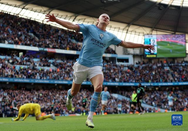 4月15日,曼城队球员哈兰德在比赛中庆祝进球。