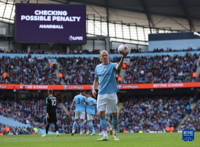4月15日,曼城队球员哈兰德在主罚点球前。