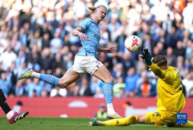 4月15日,曼城队球员哈兰德(左)攻门得分。