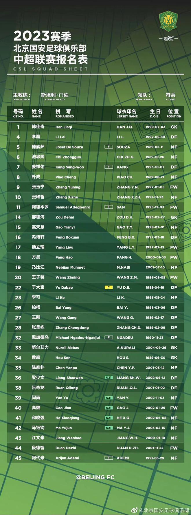 同一时间,北京国安也公布了新赛季的34人大名单,球队包括4位外援:尼日利亚27岁的阿德本罗,31岁北马其顿的阿代米,34岁的巴西的德索萨,以及32岁喀麦隆的恩加德乌。