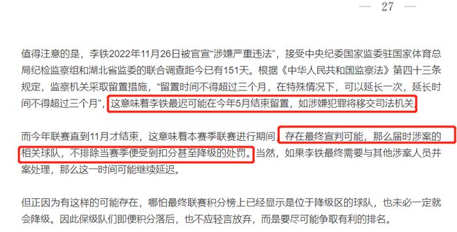 而且,在中超新赛季进行期间,李铁案最终可能会宣判,涉案的相关球队,不排除当赛季受到扣分甚至降级的处罚。所以,即便在新赛季处于降级区的球队,也未必一定会降级,而保级区的球队,即便积分落后,也不应该放弃,而是尽可能争取有利的排名。