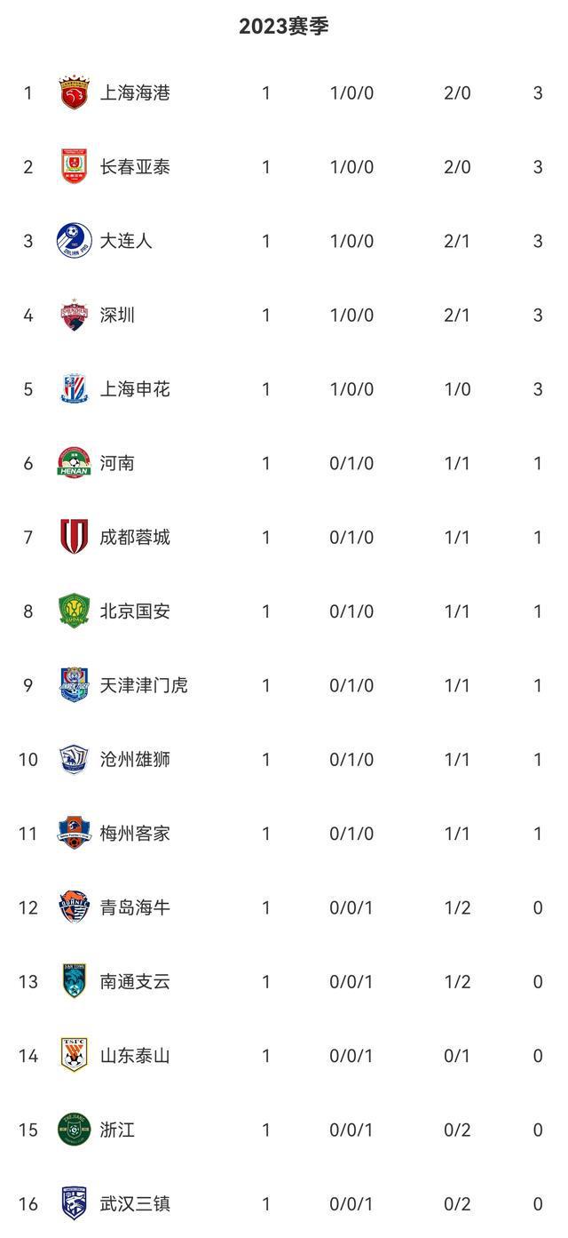 (中超积分积分榜)中超首轮积分榜:海港、亚泰、大连人、深圳、申花取开门红