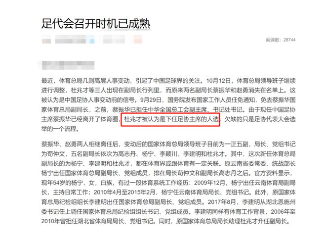 2017年,在新任体育总局局长苟仲文上任半年后,杜兆才成功晋升为局长助理,站到了部级官员的大门口。