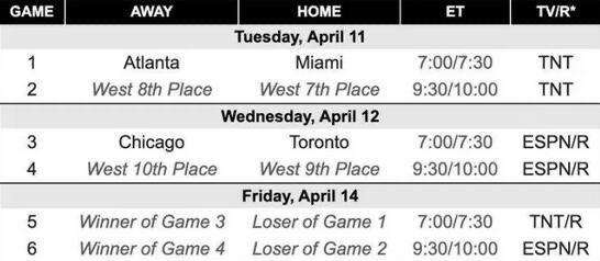 猛龙主场对阵公牛的比赛将于北京时间4月13日早上7时开打,两支球队赢球的一方将与热火和老鹰比赛的失利方争夺东部最后一张季后赛门票,这场比赛将在北京时间4月15日早上7点开打。