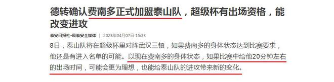 不过事与愿违,这位30岁国脚并未亮相。因而,费南多能否加盟也存在疑问,直到4月7日,费南多完成签约后,抢在俱乐部之前在个人社交平台官宣加盟泰山,这笔转会也画上了句号。