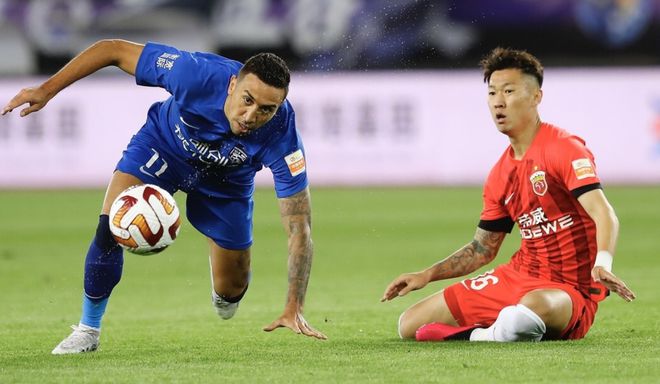 第23分钟,蒋光太为了阻止戴维森带球突破,直接把他放倒,这让蒋光太拿到一张黄牌,这也是全场的第一张黄牌。3分钟后,邓涵文受伤了,无法坚持下去,被换下场。第29分钟,武汉三镇发动反击,谢鹏飞在边路带球长驱直入,突入禁区,起脚抽射,踢偏了。5分钟后,武磊抓住对手后卫的失误,带球到了底线附近,他没有自己射门,而是把球横传门前,但是,队友没有包抄到位,没能形成射门机会。第42分钟,韦世豪在禁区左侧拔脚怒射,踢飞了。半场结束,双方都没能够取得进球。