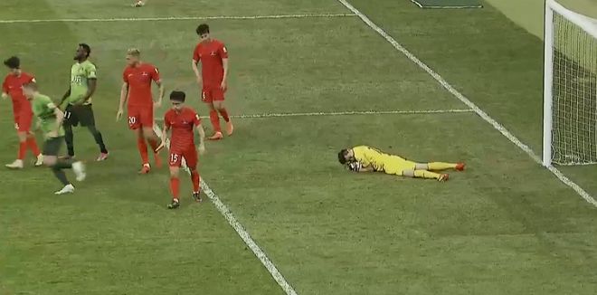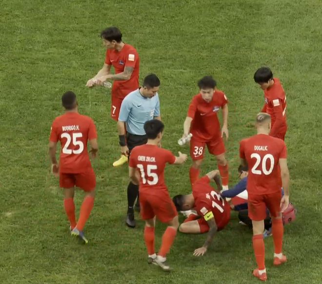 第34分钟,后卫王刚作为一员老将,在后防线上解围,竟然将球踢呲了,皮球往着反方向的底线飞去,白白送给人家一个角球。这个防守的失误,也让王刚一个劲的摇头。