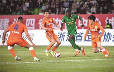 4月1日,衢州有礼·2023“体彩杯”男子职业邀请赛举行。图为浙江队球员埃沃洛(右二)在比赛中突破山东泰山队的防守。新华社记者 江汉摄