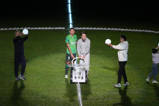 北京国安队功勋教练金志扬,与现役球员张玉 宁一起,手推划线车,亲手绘制出 2023 新赛季揭幕战赛场的中场线。