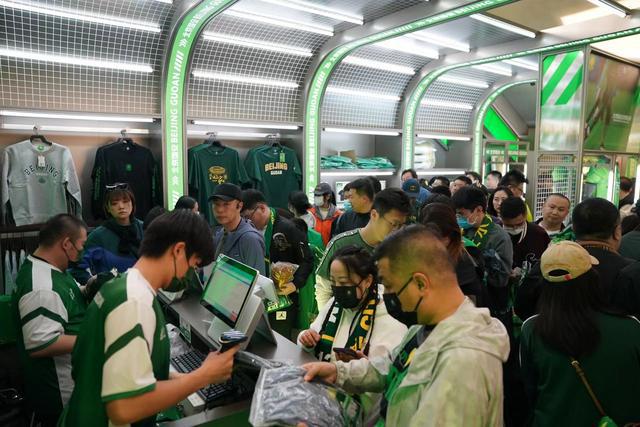 球迷们在纪念品商店购买国安服饰,正排队结账。