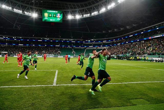 国安队进球,张稀哲与球员们庆祝,现场球迷沸腾。