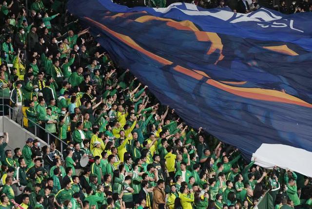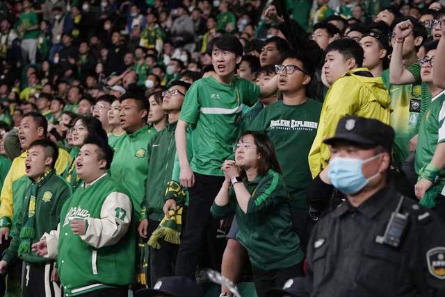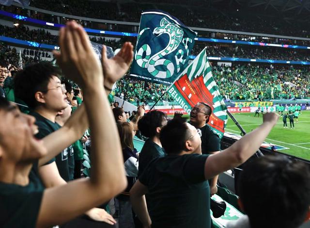 4月15日,新工体,数万球迷挥旗欢呼歌唱为比赛助力。