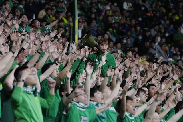 球迷们高举双手,边唱边呼喊,其中一位球迷扛起大喇叭,组织球迷喊加油口号,为国安加油。